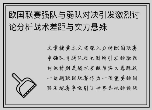 文章摘要:在竞争日益激烈的现代社会中,无论是体育、商业还是其他领域,稳扎稳打迎战劲旅并提升整体实力,都是取得成功的关键。在应对强大对手时,仅凭单一的努力或一时的爆发往往难以保持长久的优势。相反,系统化的提升和合理的战略布局,能够在对抗劲旅时占得先机。文章将从四个方面深入探讨如何稳扎稳打、提升整体实力...
