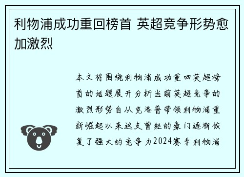 利物浦重回英超榜首,既是球队努力的结果,也是英超联赛整体竞争格局变化的体现。通过战术的调整、球队的拼搏精神以及其他球队的崛起,英超的争冠局面变得更加复杂和激烈。与此同时,曼城等传统豪门的挑战与调整,也让英超的争冠形势充满了悬念。