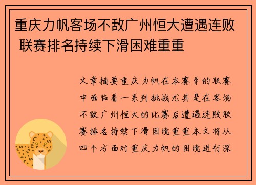 文章摘要:重庆力帆在本赛季的联赛中,面临着一系列挑战,尤其是在客场不敌广州恒大的比赛后,遭遇连败,联赛排名持续下滑,困境重重。本文将从四个方面对重庆力帆的困境进行深入分析。首先,探讨球队整体状态的低迷,包括伤病、球队士气和战术安排的失衡。其次,分析与广州恒大这场关键比赛的失利,如何导致球队陷入连败的泥潭。第三,讨论重庆力帆目前联赛排名下滑的原因,背后隐藏的管理层决策和球队运作上的问题。最后,结合重庆力帆面临的困难,展望其未来如何调整,寻求自我救赎。整篇文章旨在全面剖析重庆力帆的当前困境,并提供一些可能的解决路径。