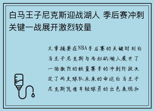 白马王子尼克斯迎战湖人 季后赛冲刺关键一战展开激烈较量