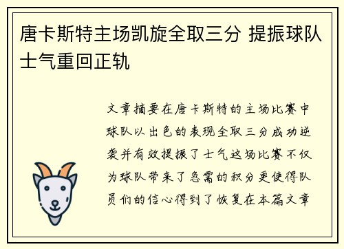 唐卡斯特主场凯旋全取三分 提振球队士气重回正轨