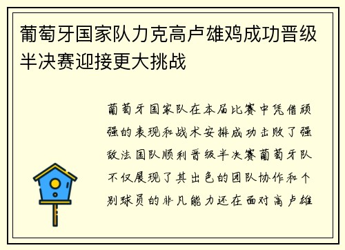葡萄牙国家队力克高卢雄鸡成功晋级半决赛迎接更大挑战