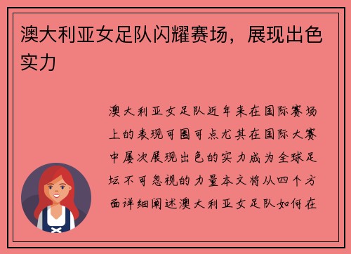 澳大利亚女足队近年来在国际赛场上的表现可圈可点,尤其在国际大赛中屡次展现出色的实力,成为全球足坛不可忽视的力量。本文将从四个方面详细阐述澳大利亚女足队如何在比赛中闪耀赛场并展现出其卓越实力。首先,澳大利亚女足队的战术执行力为其成功奠定了坚实基础;其次,队员们的个人技术与团队协作无疑是其胜利的重要因素;第三,澳大利亚女足队在面对强敌时展现出的坚韧心理素质,是其能持续高水平发挥的关键;最后,球队的领导力和教练的战略眼光为其注入了无穷动力。通过这四个方面的分析,我们将全面了解澳大利亚女足如何一步步走向世界舞台的巅峰。