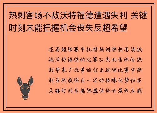 热刺客场不敌沃特福德遭遇失利 关键时刻未能把握机会丧失反超希望
