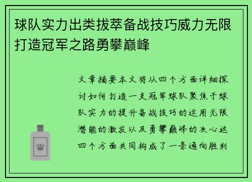 文章摘要:本文将从四个方面详细探讨如何打造一支冠军球队,聚焦于球队实力的提升、备战技巧的运用、无限潜能的激发以及勇攀巅峰的决心。这四个方面共同构成了一条通向胜利的路径。首先,球队实力的出类拔萃需要从球员的素质提升、团队协作和技术创新等方面着手;其次,备战技巧的威力体现在战术安排、对手分析和心理调控的精细运作;再者,如何激发球队的无限潜能则涉及到训练的系统性、球员的心态调整以及不断超越的动力;最后,勇攀巅峰的精神是球队走向成功不可或缺的精神力量,它不仅需要团队成员的坚定信念,更需要领导者的远见和决策力。通过对这四个方面的详细分析,本文将为读者呈现一条科学而清晰的冠军之路。